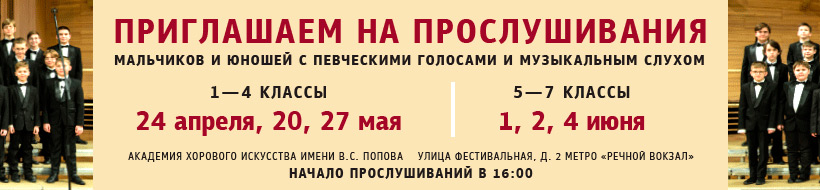 Хоровое училище имени А.В. Свешникова в составе Академии хорового искусства имени В.С. Попова приглашает на прослушивание мальчиков и юношей с хорошими певческими голосами и музыкальным слухом!
