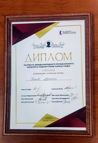 Поздравляем ассистента-стажера кафедры сольного пения Академии хорового искусства имени В.С. Попова Артёма Попова (класс заведующей кафедрой, профессора Н.А. Поповой) со званием лауреата 1 степени IV Международного музыкального конкурса-лаборатории Алисы Гицба.