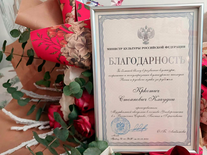 На VII Международном форуме, посвященном Дню Воина Комадина, первого декана Музыкальной академии Восточно-Сараевского университета, посол Российской Федерации в Боснии и Герцеговине Игорь Калабухов вручил Клаудии (Воислав) Кркотич Стоянович, аспиранке Академии хорового искусства имени В.С. Попова, Благодарность Министра культуры Российской Федерации за вклад, поддержку и сохранение русской музыки и культуры.