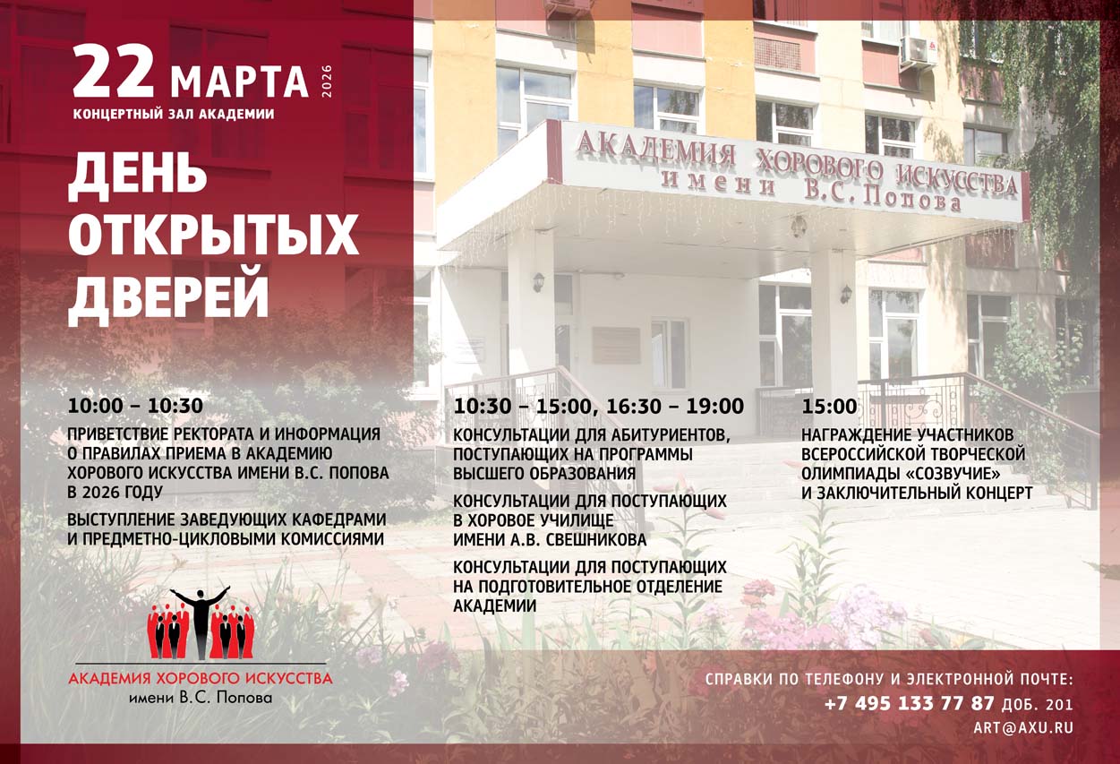 В воскресенье 22 марта Академия хорового искусства провела День открытых дверей для абитуриентов 2026 года. Студенты музыкальных колледжей и училищ, ученики общеобразовательных школ, приехавшие из разных городов России, посетили консультации заведующих кафедрами, ведущих педагогов Академии.