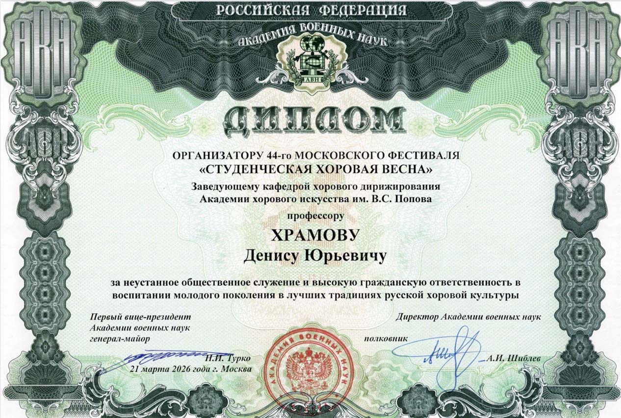 кандидат искусствоведения, заведующий кафедрой хорового дирижирования Академии хорового искусства имени В.С. Попова, профессор, почетный работник культуры г. Москвы, Заслуженный деятель Московского музыкального общества Денис Юрьевич Храмов.