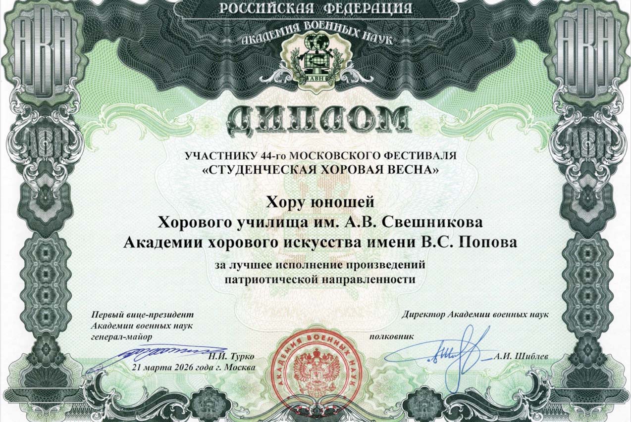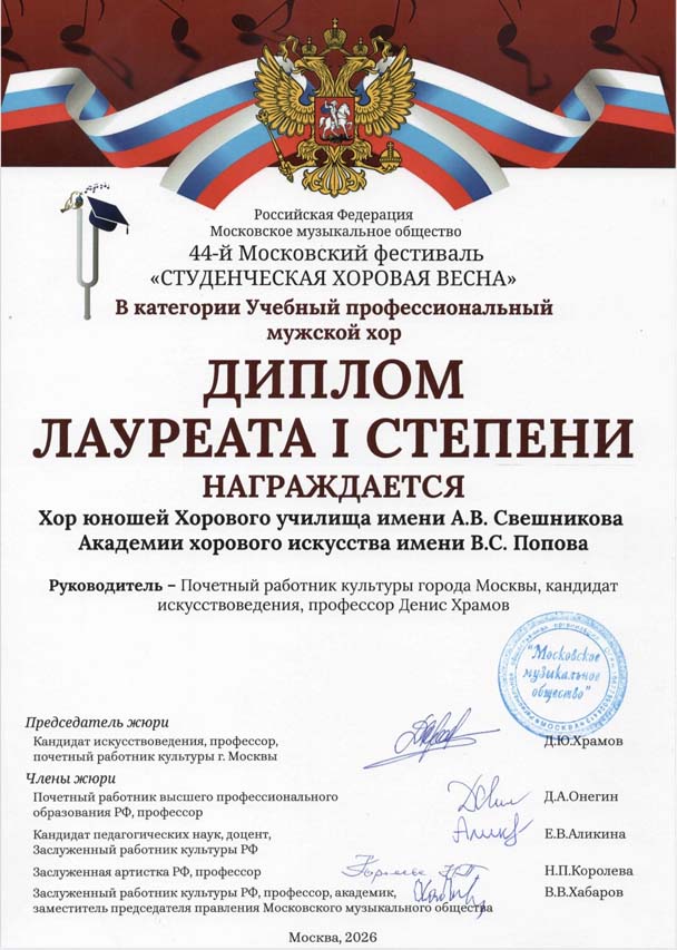 В фестивале принял участие и завоевал звание Лауреата 1 степени в номинации «Учебные хоры профильных вузов и колледжей» Хор юношей Хорового училища имени А.В. Свешникова Академии хорового искусства имени В.С. Попова, художественный руководитель – Денис Храмов.