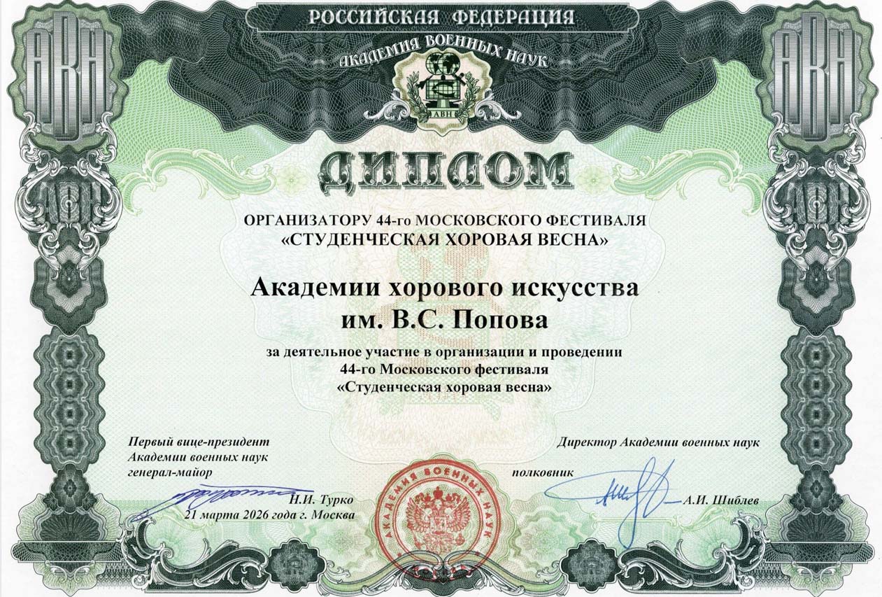 В дополнительной неофициальной номинации от Академии военных наук Академия хорового искусства имени В.С. Попова была награждена дипломом «За деятельное участие в организации и проведении 44-го Московского фестиваля «Студенческая хоровая весна», Хор юношей Хорового училища имени А.В. Свешникова Академии хорового искусства имени В.С. Попова был награжден дипломом «За лучшее исполнение произведения патриотической направленности», заведующий кафедрой хорового дирижирования Академии хорового искусства имени В.С. Попова, профессор Д.Ю. Храмов был награжден дипломом «За неустанное общественное служение и высокую гражданскую ответственность в воспитании молодого поколения в лучших традициях русской хоровой культуры».