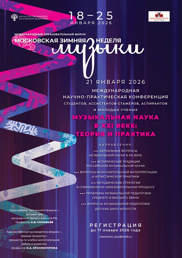 II Международный образовательный форум «Московская зимняя неделя музыки» проходил в Академии с 21 по 24 января. В рамках мероприятия 21 января состоялась Международная научно-практическая конференция студентов, ассистентов-стажеров, аспирантов и молодых ученых «Музыкальная наука в XXI веке: теория и практика». В конференции приняли участие 29 представителей учебных заведений Российской Федерации, Республики Абхазия, Республики Босния и Герцеговина, Китайской Народной Республики, Республики Сербия. В этот же день в Концертном зале Академии состоялся мастер-класс по композиции профессора Е.И. Подгайца. Свои сочинения мэтру продемонстрировали учащиеся Хорового училища имени А.В. Свешникова Святослав Паршаков, Елисей Чурилов, Егор Парфенюк, Дмитрий Барнов. Учащиеся получили высокие оценки, ценные замечания и добрые напутствия!