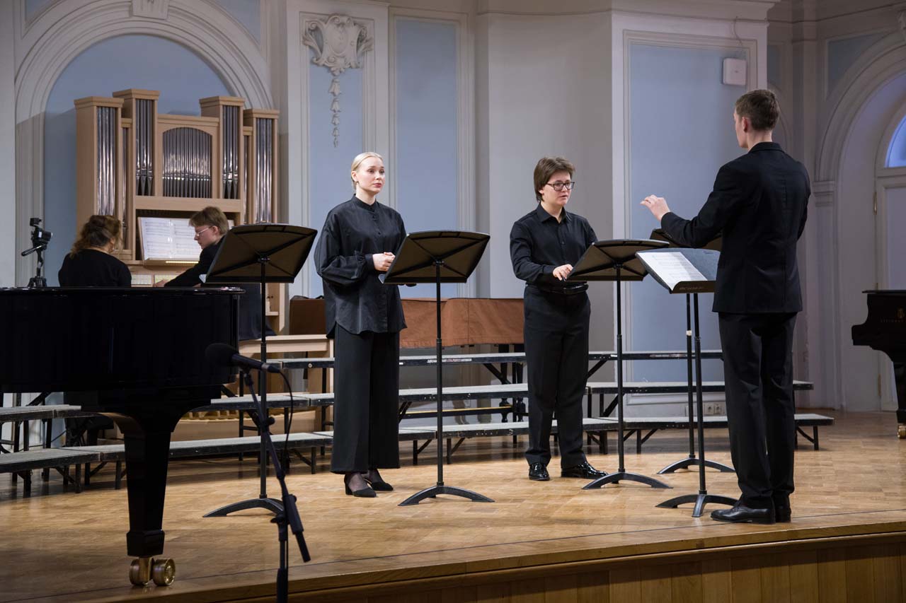 Первая часть концерта включала хоровые сочинения. Программу открыли переложения романсов С.В. Рахманинова «Здесь хорошо» и «Сон» в исполнении Камерного хора Московской консерватории (художественный руководитель и дирижер — Александр Соловьёв). В память о выдающемся российском композиторе, выпускнике Хорового училища имени А.В. Свешникова и почетном профессоре Академии, ушедшем в 2025 году — Родионе Константиновиче Щедрине, прозвучал «Вокализ» К. Бодрова. Вниманию слушателей были представлены две мировые премьеры хоровых сочинений Ефрема Погайца — «Все это было бы смешно» (солист — Гордей Мирошников) и «Волшебство» (партия фортепиано — художественный руководитель форума, первый проректор – проректор по учебно-воспитательной работе и развитию, профессор Ольга Красногорова).