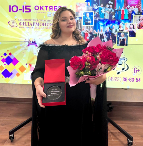 С 10 по 15 октября 2025 года в г. Владимир состоялся XI Всероссийский конкурс исполнителей романса. Поздравляем ассистента-стажера Академии Татьяну Сидякину-Чендеву, удостоенную Гран-при конкурса! Поздравляем педагога — заслуженную артистку РФ, профессора кафедры сольного пения Светлану Ивановну Оссовскую!