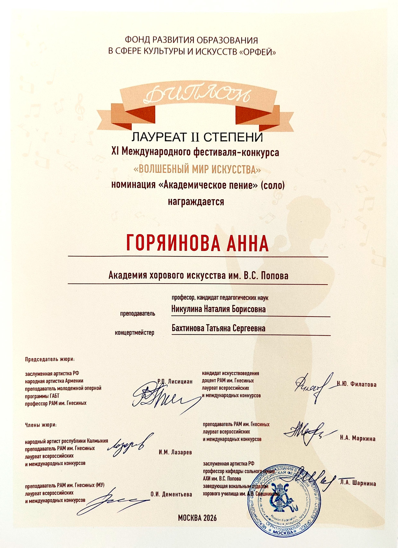 Студентка кафедры сольного пения Анна Горяинова (класс профессора, кандидата педагогических наук Н.Б. Никулиной) удостоена звания лауреата II степени XI Международного фестиваля-конкурса «Волшебный мир искусства».