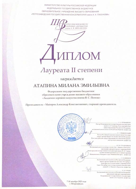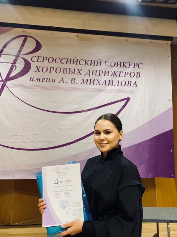 По итогам III Всероссийского конкурса хоровых дирижеров имени А.В. Михайлова студентка 2 курса кафедры хорового дирижирования Милана Атапина (класс ст. преподавателя А.К. Майорова) удостоена звания лауреата 2 степени.