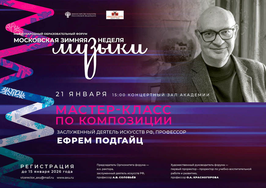 21 января в рамках Международного образовательного форума «Московская зимняя неделя музыки» в Концертном зале Академии состоится мастер-класс по композиции заслуженного деятеля искусств РФ, профессора Ефрема Подгайца.