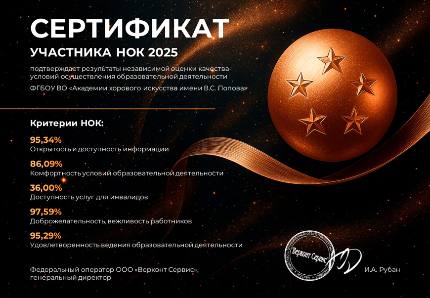 В 2025 году Академией хорового искусства имени В.С. Попова успешно пройдена Независимая оценка качества условий осуществления образовательной деятельности. Экспертиза включала выездную проверку, анкетирование обучающихся.