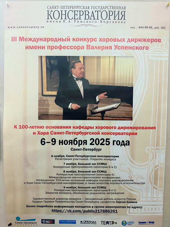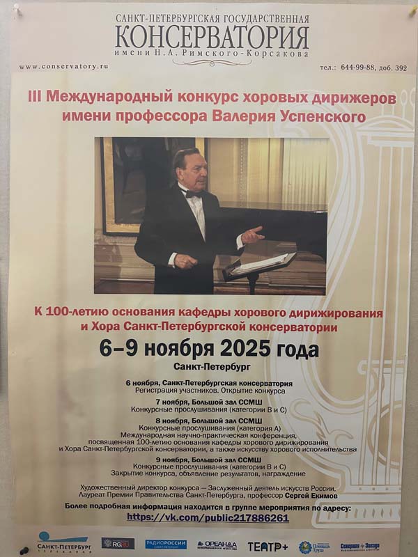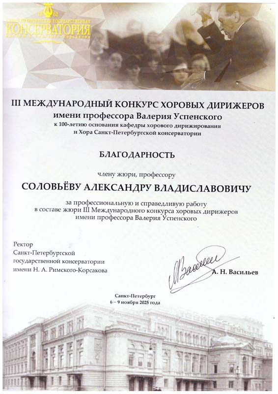 Благодарим Санкт-Петербургскую государственную консерваторию имени Н.А.Римского-Корсакова и лично ректора заслуженного артиста РФ, профессора А.Н. Васильева за прекрасную организацию конкурса, память о выдающемся хормейстере Народном артисте РФ, профессоре В.В. Успенском, которую трепетно сохраняют председатель жюри и художественный директор конкурса – декан факультета композиции и дирижирования, заслуженный деятель искусств РФ, профессор С.В. Екимов, со-председатель жюри, заведующий кафедрой хорового дирижирования, профессор А.А. Максимов.